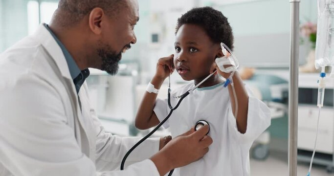 Doctor, patient and child with stethoscope, hospital and check up for health, breathing and illness. Smile, playing and pediatrician for wellness, medical and asthma for heart, healthcare or medicine