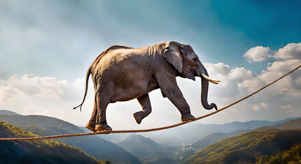 The elephant walking on the rope above the mountains in the blue sky. Visual with the theme of perseverance against the impossible.