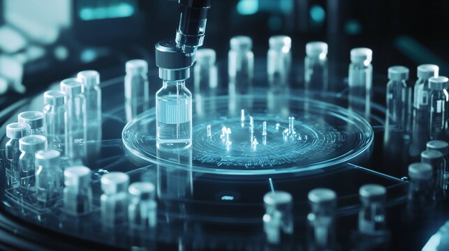 Futuristic glowing blue capsule with digital circuit design on neon floor represents technology, innovation, artificial intelligence, and vision of medicine tomorrow