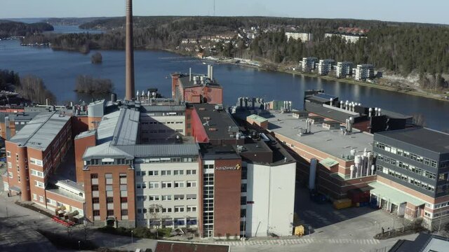 Aerial view of AstraZeneca pharmaceutical factory building in Sodertalje. High quality 4k footage