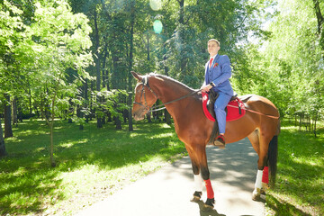 Rich feudal lord wearing luxury suit sitting astride dappled pedigree horse
