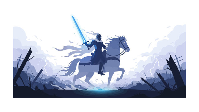 Heroic Figure Riding Through Battle: A valiant knight astride a majestic steed, wielding a glowing sword, charges fearlessly through a tumultuous battlefield landscape, symbolizing valor and courage.