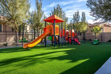bold park tools sit on man-made turf youth play space glad open on sunny morn trees gate about playground sharp tones blue sky show fun child play