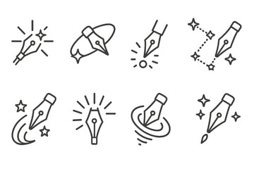 Stellar Pen Icons. Line style icons of stellar pen tools: shining pen, orbit line, glowing dot, constellation stroke, star path,
