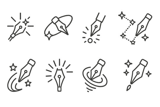 Space Calligraphy Icons. Line style icons of space calligraphy tools: radiant brush, flowing orbit, stellar stroke, galactic ink