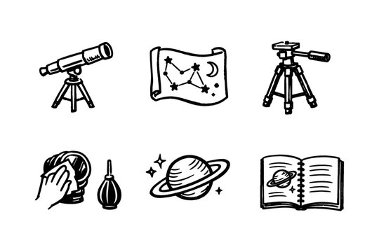 Outline icons of telescopes, constellations, globes, and navigation tools