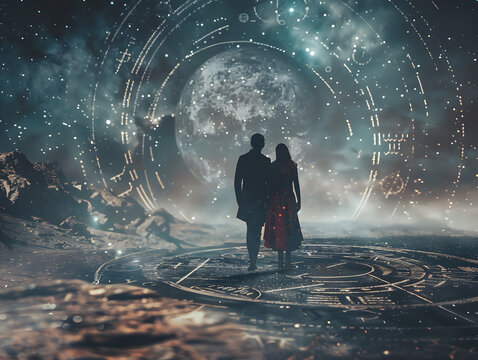 Loving couple strolling along a peaceful beach at sunset with a zodiac wheel in the foreground, symbolizing themes of romantic connection, fate, and astrological guidance