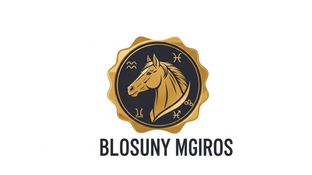 Golden horse head logo on black circle with astrological symbols and text blosuny mgiros on white background