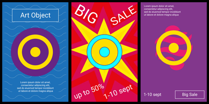 Trendy retro posters for organizing sales and other events. Large astrological mercury symbol in the center of each poster. Vector illustration on black background