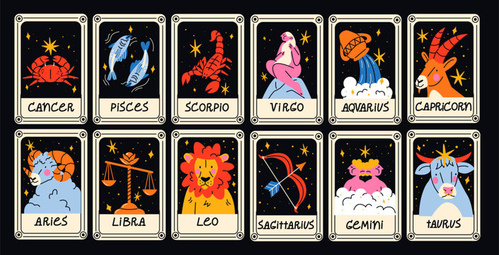 Astrological Cards of constellations and zodiac signs, star horoscopes in cartoon style. Cancer, Pisces, Scorpio, Virgo, Aquarius, Capricorn, Taurus, Libra, Leo, Sagittarius, Gemini, Aries. Magic card