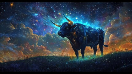 Majestic bull in a cosmic setting with glowing stars and constellations. Zodiac theme, power, nature, astronomy-inspired artwork, strength, and astrological symbolism. Generative AI.