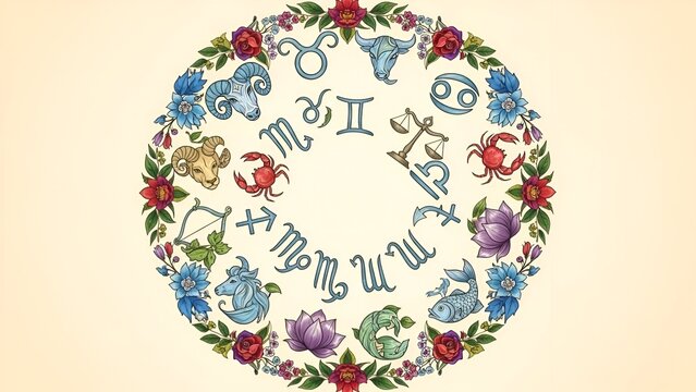 Decorative floral wreath illustrating all twelve astrological zodiac signs, representing celestial harmony, cosmic influence, and individual personality traits