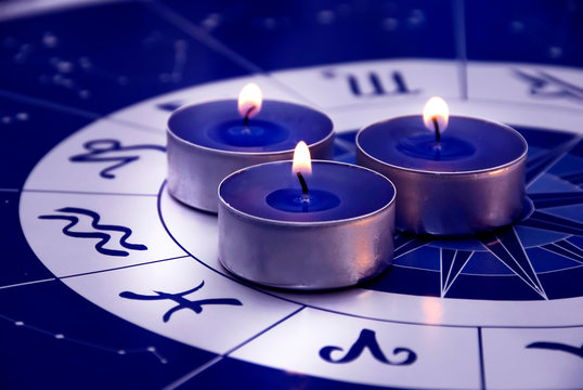 Blue horoscope with zodiac signs and three candles like astrology concept