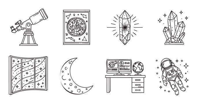 Set of eight minimalist black line art icons , featuring themes of space exploration and astrology with a telescope, astronaut, crystals, and star charts