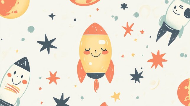 Adorable space-themed graphic with smiling moon and stars, cheerful astronaut characters, simplified rocket ships, soft color palette with pastel backgrounds, perfect for children's interior design