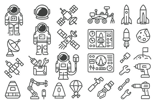 Collection of space exploration icons featuring astronauts, rockets, and technology in a minimalist design