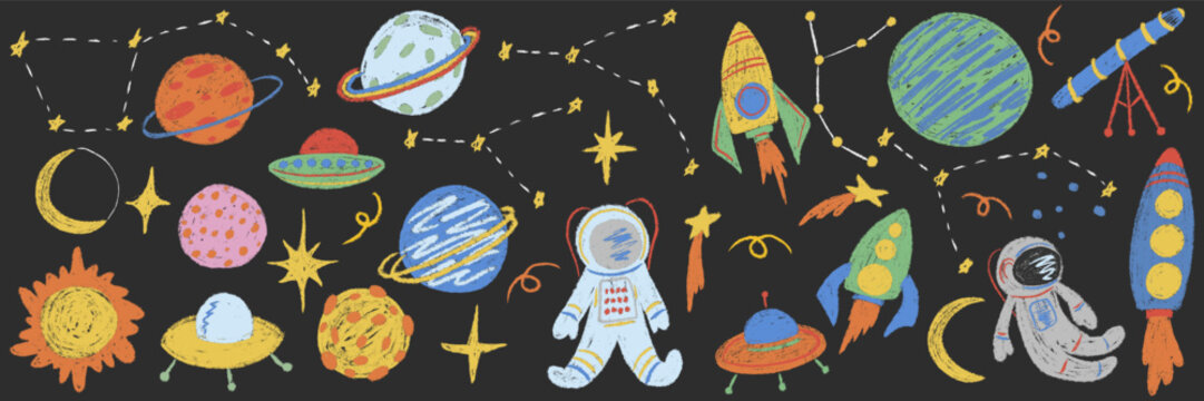 Kids chalk drawings galaxy big set. Collection freehand child baby hand drawn scribble elements. Textured planet, stars, astronaut, rocket, telescope, alien UFO spaceship. Vector illustration isolated