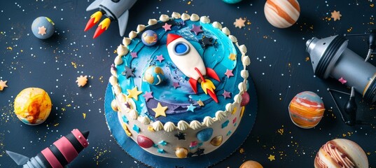 Space Adventure-Themed Birthday Cake with Astronauts, Rockets, and Planets for Party Decorations