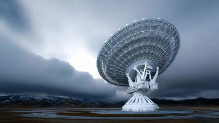Very large radio telescope array with massive parabolic satellite dishes pointing toward the sky, ground-based deep space communication and astronomical observatory 4k