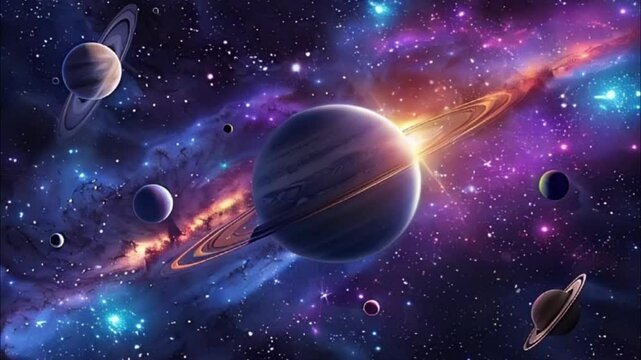 Planets gather in the solar system amidst glowing stars in a vibrant cosmic atmosphere