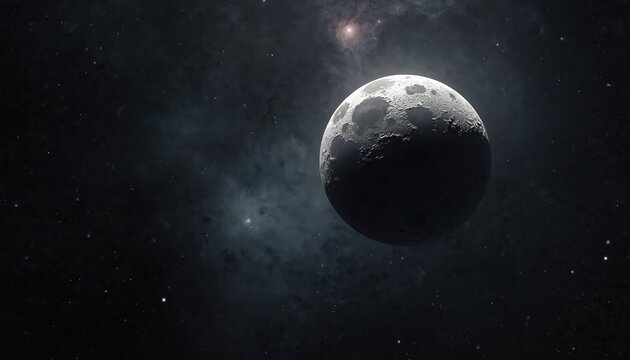 Detailed 3d render of Moon surface with visible craters against backdrop of stars, planets, nebulae. Lunar satellite in dark sky. Space exploration, astronomical research, scientific background.