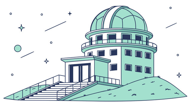 An illustration of an astronomical observatory on a hill against a starry night sky with planets and meteors.