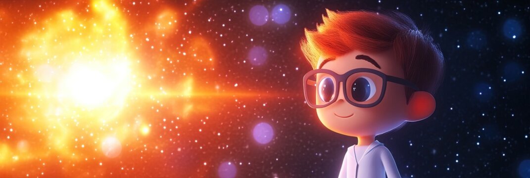 2D animation astronomy concept with astronomist standing in front of space and planetary universe