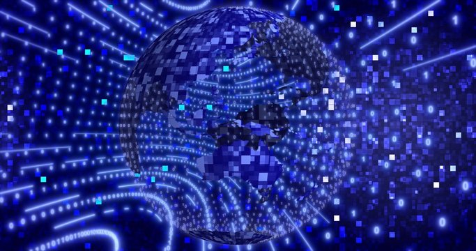 Neon Digital binary background with rotating Planet earth. animation for network, digital event. 3D illustration