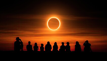 Silhouetted figures watch a fiery solar eclipse against a dramatic sunset sky