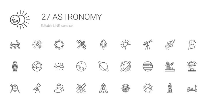 Astronomy and space exploration icon set. Thin line editable stroke icons for astrophysics, planets, rockets, astronauts, solar system, satellites, galaxies and outer space observation science