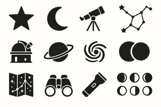 Astronomy icons: telescope, constellation, planet, moon phases, observatory