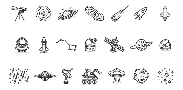 Space icon set. Containing science, astronomy, satellite, universe, astronaut, rocket, comet, telescope, planet, solar system, galaxy and more. Editable line icons. Vector illustration.