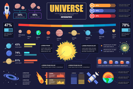 Universe concept banner with infographic elements. Space research, solar system with planets, celestial bodies. Poster template with graphic data visualization, timeline, workflow. Vector illustration