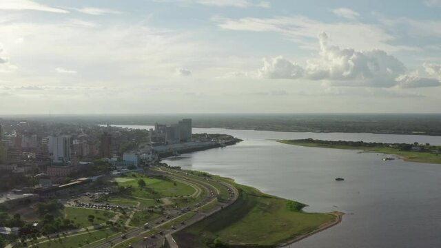 Aerial view Asuncion river Paraguay. Cityscape with downtown on the river, the shoreline on which there are houses and the road on which cars drive.