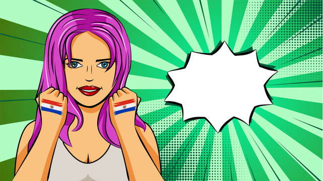 European woman paint hands of national flag Paraguay in pop art style illustration. Element of sport fan illustration for mobile and web apps