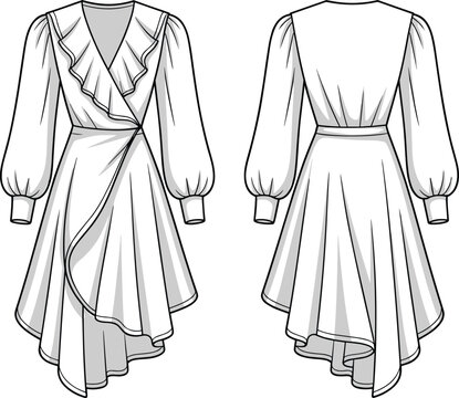 Wrap dress with ruffled neckline and asymmetrical hem, cuff sleeve fashion template, cad drawing flat vector illustration, garment layout designWrap dress with ruffled neckline and asymmetrical hem