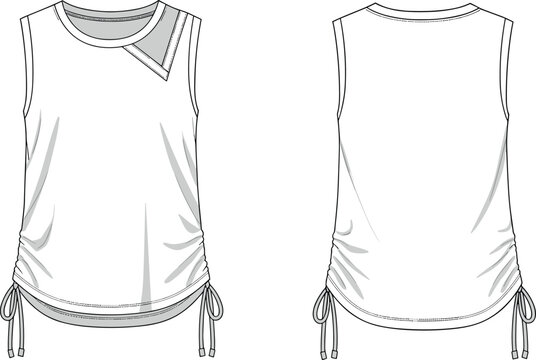 Sleeveless top fashion sketch, technical garment illustration, asymmetric neckline, side ruching, drawstring hem, front and back view, apparel design