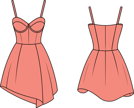 Spaghetti strap dress illustration set, asymmetrical and high-low hem designs, corset and straight necklines, coral fashion vector, isolated white background