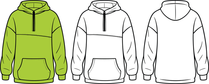 Green biker jacket technical sketch, asymmetrical zipper, wide lapels, zip pockets, belted waist, front and back view, fashion flat, garment design vector illustration