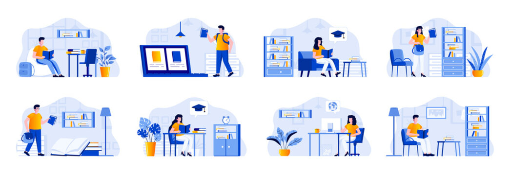 Education scenes bundle with people characters. Distance learning program in university, students studying in library, read book at home situations. Online education platform flat vector illustration.