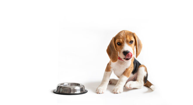 Beagle puppy licks his lips in front of a bowl