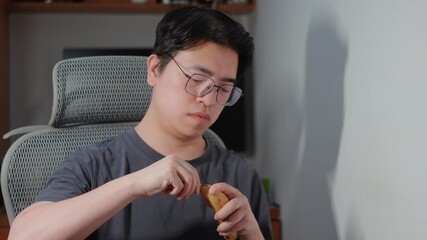 A young Asian Chinese man peeled a banana in his bedroom at home and ate it heartily as a healthy meal for his weight-loss dinner.
