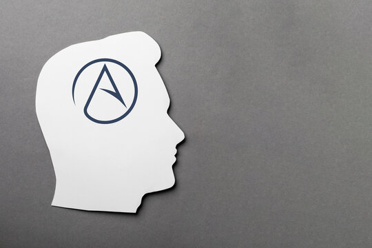 Paper human head with symbol of atheism on grey background, top view. Space for text