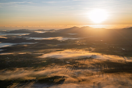 Atherton Tablelands, North Queensland, foggy morning sunrise, aerial view from hot air balloon