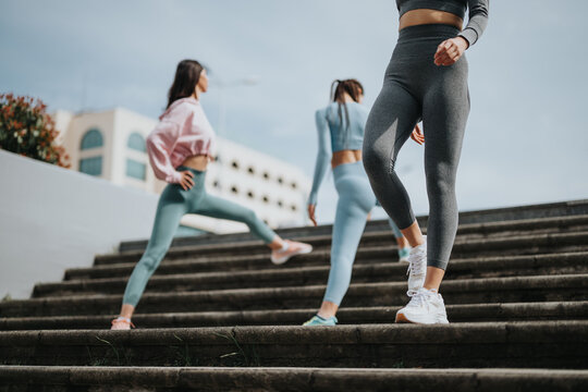 Low angle view of two active women in athletic wear running up staircase outdoors, focused on healthy lifestyle and fitness training.
