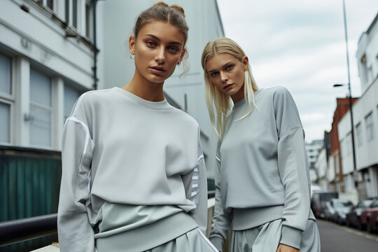 Five diverse female fashion models posing in stylish hoodies and tracksuit bottoms, showcasing trendy athleisure wear