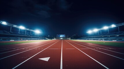 An empty outdoor running track at night with the stadium lights shining. From the perspective on the 100 meter dash finish line. Cinematic lighting