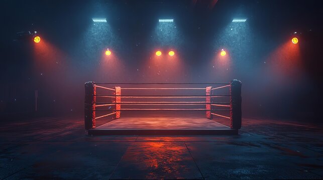 A boxing ring illuminated by a spotlight, creating an atmosphere of anticipation and tension before the match against a dark background