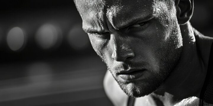 Watercolor close-up of a male athlete's face, drenched in sweat, showcasing his Raw emotion and fierce gaze highlight the dedication required in high-level sports