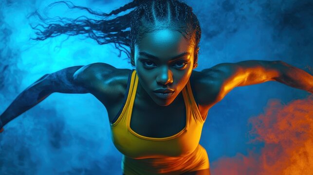 Powerful athlete in dynamic pose, illuminated by vibrant blue and orange lighting.  A strong and determined expression.